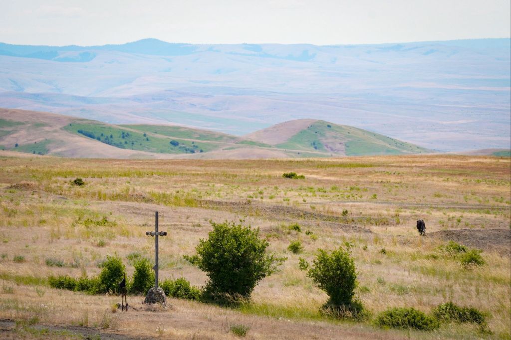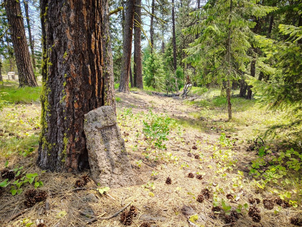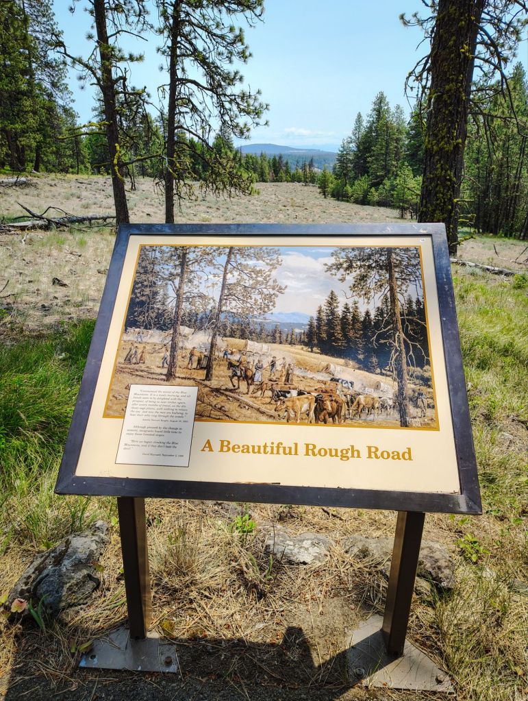 The place we stopped at was just off Highway 84, halfway between La Grande and Pendleton, at an Interpretive Trail called The Blue Mountain Interpretive Park. It was a beautiful park with authentic looking trail markers and off-loaded pioneer memorabilia, impressive historic signs  with insightful quotes, and great paintings that mirrored the surrounding landscape.