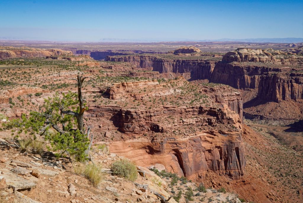 Despite the fact that it was nearly 90°, I was feeling quite comfortable breathing in the warm juniper scented air; I knew the best viewpoints were just a hop, skip and a holler up the trail. Indeed, there was so much new to see I was feeling almost giddy!  After all, it’s not every day that I get to witness a 15 ft. tall cone shaped boulder, an ancient juniper tree on its last leg of life, or an epic technicolor canyon view.