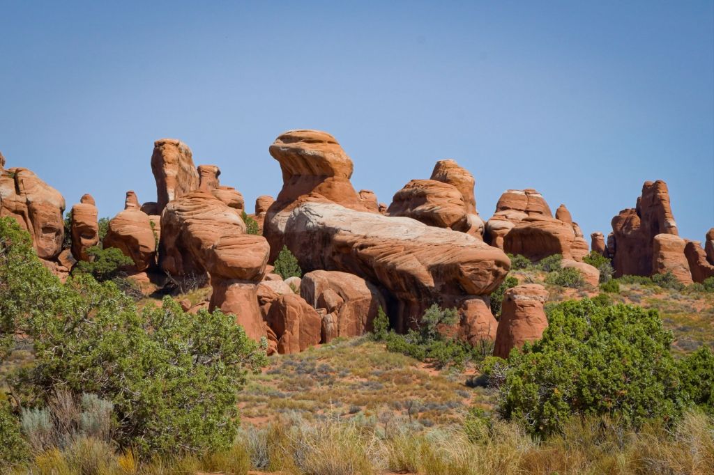 In Canyonlands we did a short hike, called the Aztec Trail, up over a steep rock face that would be unnavigable, were it not for those who went before and left piles of rock to lead the way.