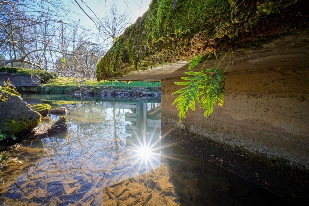 Perhaps there was more to this place than just an artificially crafted water feature. Kneeling at the waters edge I noticed a pretty little fern growing up under the concrete, some moss and ivy spreading out along the rocks, and the Sun light reflecting off the relatively clear looking water.