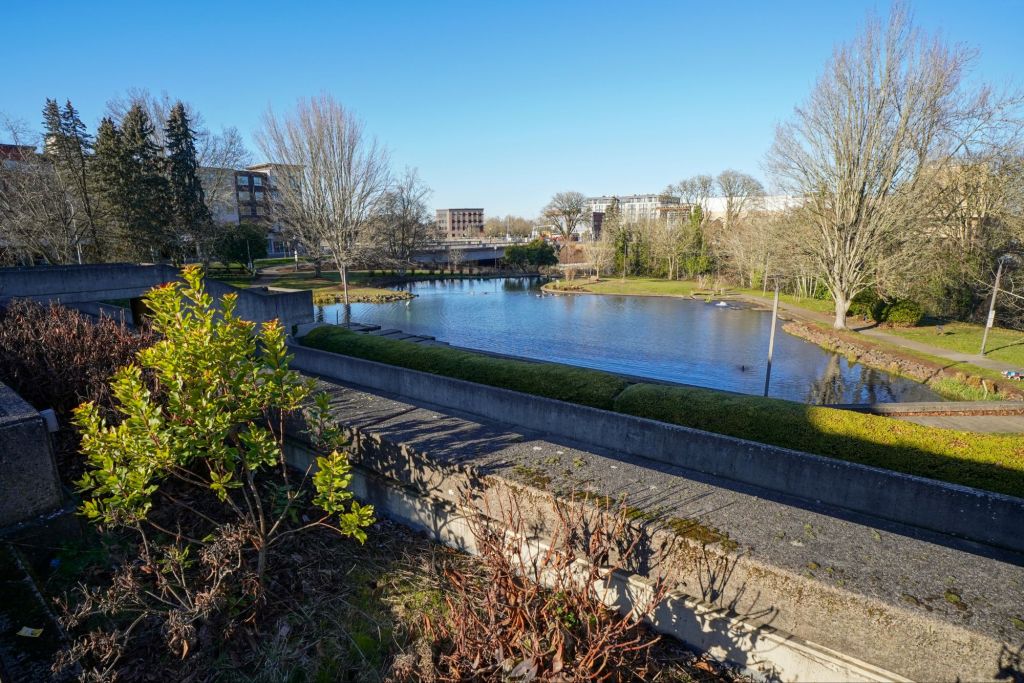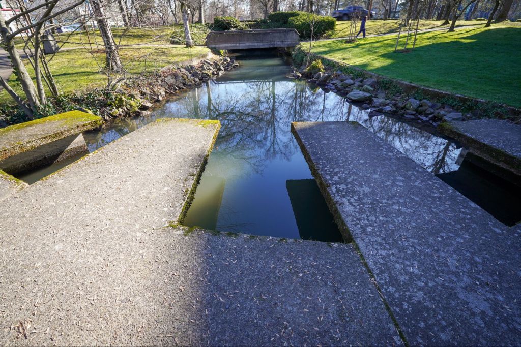 While looking for a parking place by the city hall building I noticed Pringle Creek, and noted how a portion of it diverged to run through the City Hall courtyard area.
