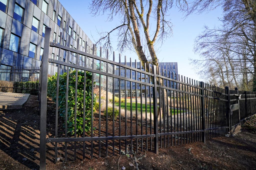 Apparently the reason for this, I found out later, was to honor the recently deceased President Jimmy Carter. Strangely, though, during the whole time I was standing there only the United States flag was catching any wind and flapping. I’m still not sure what to make of this phenomena, as it was the Oregon flag that was up wind from the US flag and should have been receiving at least as much of the air. Perhaps it was divine intervention, trying to communicate that Oregon is currently less inspired and moved by the Holy Spirit than the Nation is as a whole…but that is just a guess. What I did begin to perceive is that this not-for-profit organization, which literally has as its aim to help workers recover from injuries, is perhaps like a “tree of life”, planted in this park and city and state to help bring healing where it is needed. The fence that surrounds the back side of the building is not there just to keep trouble makers out, just as the walls of the New Jerusalem are not there to keep people out, but to make sure that they come in through the entry place where they can be properly acknowledged and cared for.