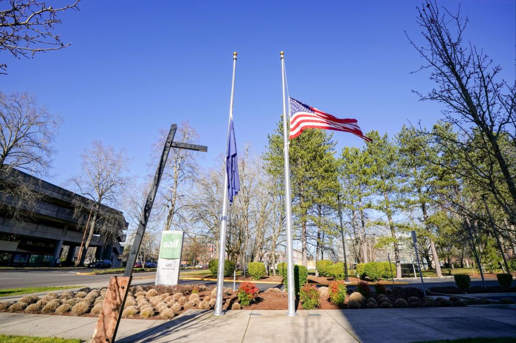Then, as I came around the corner of the building I noticed a sign that said “Saif” with their company moto beneath, “Work. Life. Oregon.” Wow! I thought, that kind of sounds like how some trendy new church would advertise their community outreach program. They had a much more inviting looking entry area, with a large lobby, and out front an Oregon and United States Flag staged prominently and flying at half-staff.