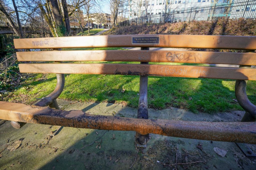 And so as I walked back through the park I prayed to have the sight to see how our Heavenly Father’s kingdom and personal touch is at work in this imperfect world that we live. I came to a bench donated in honor of someone named Tim and Michael Triplett of whom it states “You brought us smiles”. Sadly though, the bench was much abused, even lit on fire at some point,…I hope not while someone was sleeping on it. But it made me wonder, who had the idea of placing the bench there in the first place? Maybe it was the Holy Spirit moving upon somebody’s heart! Perhaps that same Holy Spirit nudge will move again in somebody’s heart to repair the bench and make it serviceable again.